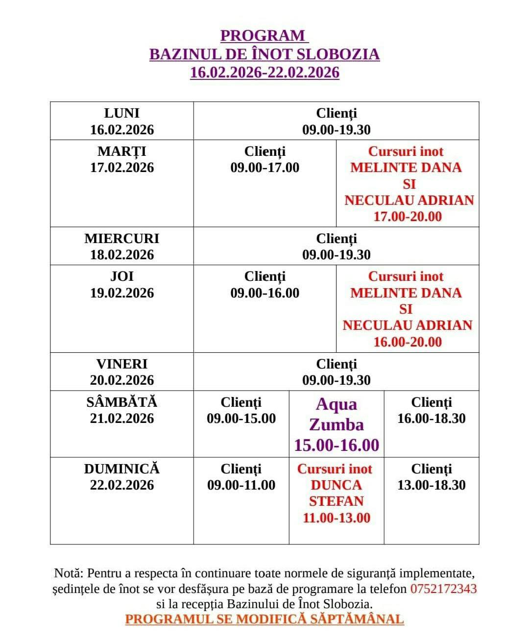 De reţinut că Programul Bazinului se modifică săptămânal!