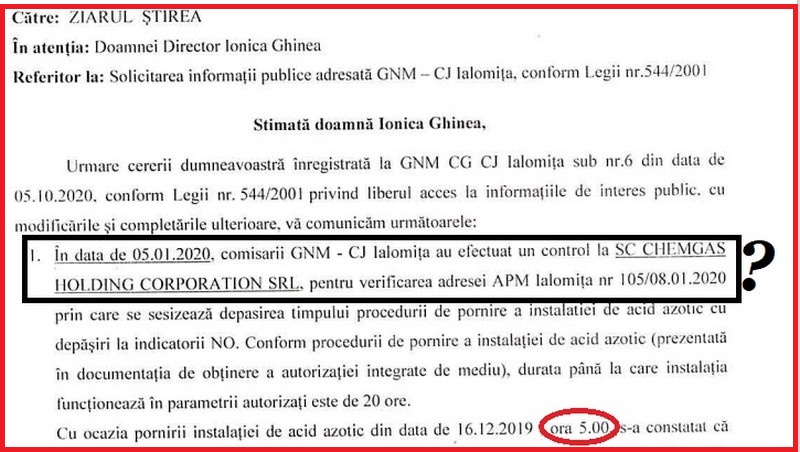 „ Urmare a cererii dumneavoastră (…) vă comunicăm următoarele: În data de 05.01.2020 comisarii GNM – CJ Ialomiţa au efectuat un control la SC CHEMGAS HOLDING CORPORATUION SRL, pentru verificarea adresei APM Ialomiţa nr. 105/08.01.2020 prin care se sesizează depăşirea timpului procedurii de pornire a instalaţiei de acid azotic cu depăşiri la indicatorii NO. Conform procedurii de pornire a instalaţiei de acid azotic prezentată în documentaţia de obţinere a Autorizaţiei de integrate de mediu, durata până la care instalaţia funcţionează în parametrii autorizaţi este de 20 de ore. Cu ocazia pornirii instalaţiei de acid azotic din data de 16.12.2019, ora 5:00 s-a constatat că durata intrării în parametrii a instalaţiei a depăşit 20 de ore, în fapt prelungindu-se cu încă 13 ore din care s-au înregistrat depăşiri la indicatorul NO,