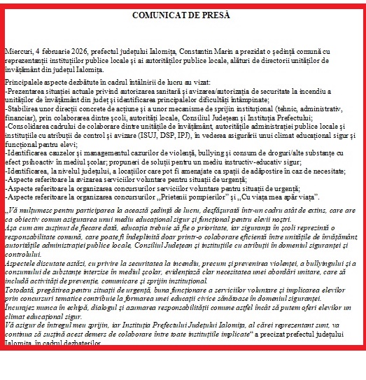 Miercuri, 4 februarie 2026, Prefectura Judeţului Ialomiţa a desfăşurat o altă ședință, la care au participat aceiaşi reprezentanții ai aceloraşi instituții publice locale, alături de directorii unităților de învățământ din județul Ialomița.