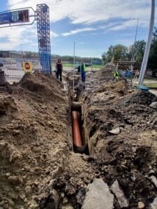 În zona Stadionului “1 Mai” a fost realizată conectarea sistemului de drenare a apelor pluviale de pe terenul de joc la rețeaua orașului. Urmează finalizarea lucrărilor și aducerea terenului la starea finală.